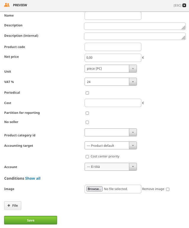 - Accounting account: You can choose an accounting account for the product. Note that this option is not visible if you have not yet created any accounting accounts.