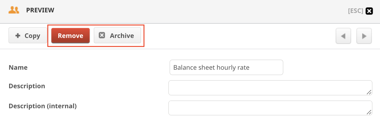 If the product has not been used as a rate level for a task or has not been invoiced yet, then the product will have a "Remove" button which deletes the product. If the product has been used as a rate level for a task or it has been invoiced, it cannot be deleted because it is needed for reporting purposes. "Archive" button will hide the product from menus and it cannot no longer be added to invoices.
