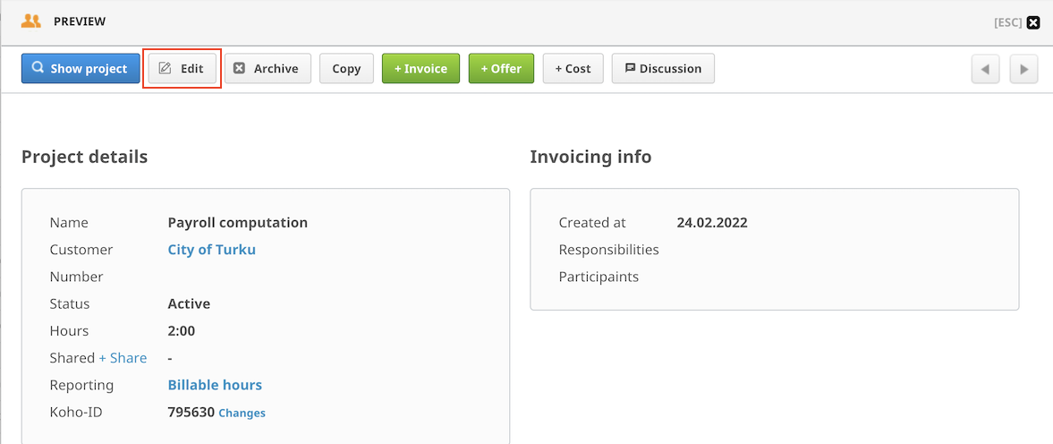 On the preview window click the "Edit" button to start editing your project. Remember to save after you have made the changes. Read more about the different definitions for projects from this article: 3.3.1 How to create a project?