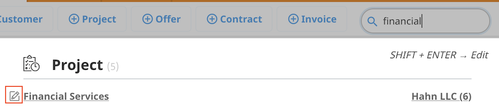 If you are using the search bar to find your project, click the name of the project on search results which will open the preview window. You can also click the edit button next to the name to start editing the project.