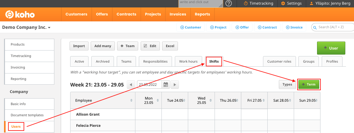 Admin users must set working hour targets for employees to follow flexitime. Hour targets are set on the "Users" page on the "Shifts" tab. Click the "+Term" button to set working hour targets.