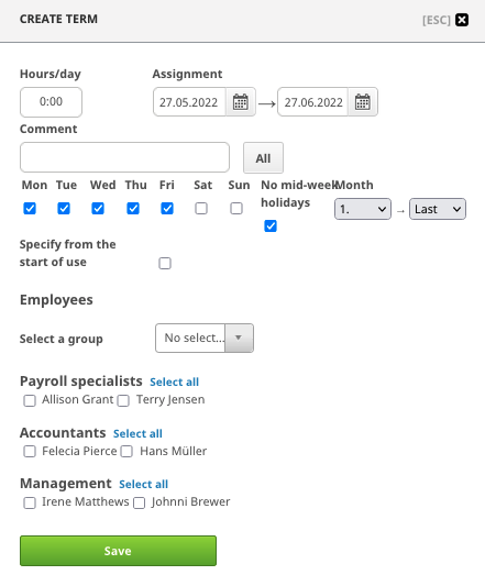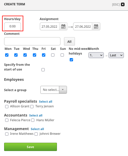 On the "Create term" window set the working hour target (e.g. 7:30 hours/day) and the time period. From the day selections you can choose for which days the hour targets are set (this can be used e.g. for employees who work 3 or 4 days per week). With the "No mid-week holidays" selection you can choose whether hour targets are set for mid-week holidays. In order for the mid-week holiday calendar to function properly, it is not recommended to set hour targets more than two years beforehand. With the "Specify from the start of use" selection the hour targets are set only for time period where the user had been created. You can also add a comment to the hour target.
