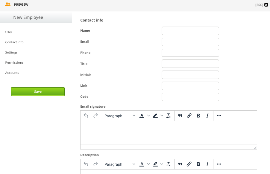 Contact information for the new user can be added on the "Contact info" tab. It is recommended to at least fill in a name and an e-mail address. You can also complete them with the following information that can be used e.g. when using offer and contract templates:
