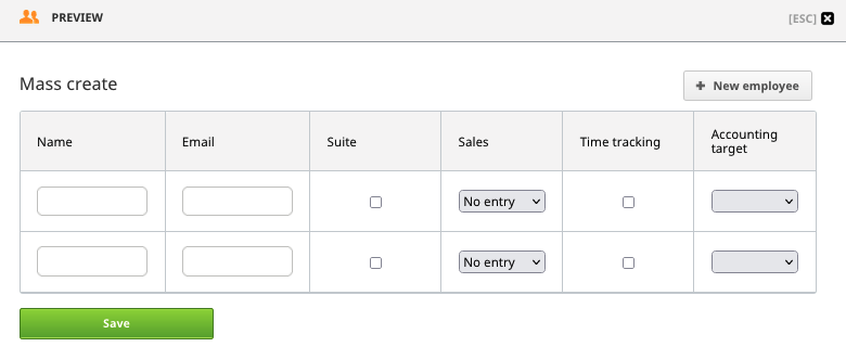 Create a new row by clicking the "+New employee" button. After you have created users, click the "Save" button. The new users will receive a message which has guidelines on how to get a password.