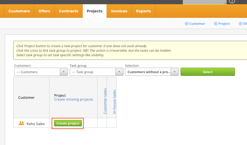 Now the list shows only customers that don’t have a project. Click the "Create project" button to create a project for the customer.