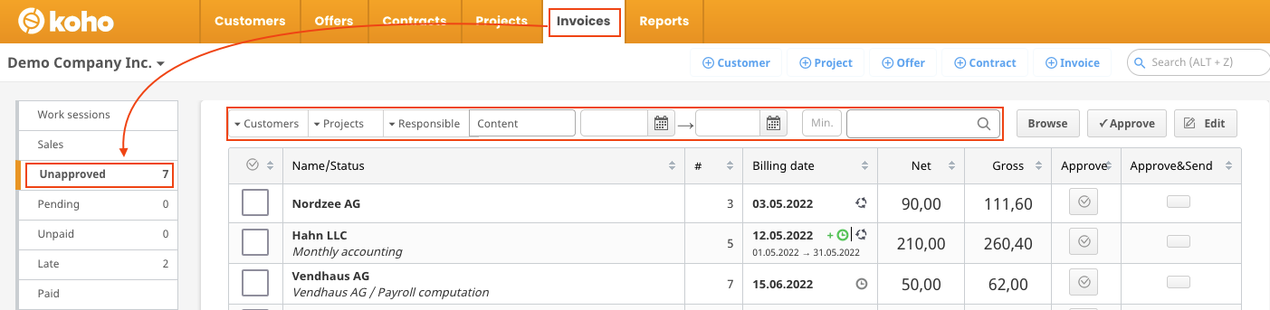 On the "Unapproved" tab you can filter invoices by customers, projects, responsible persons, accounting targets, content ( shifts, products or services), date or minimum value. You can also search for a specific invoice from the search field. Tip! If an invoice seems to be missing from the list, remember to check if you have some active filters.