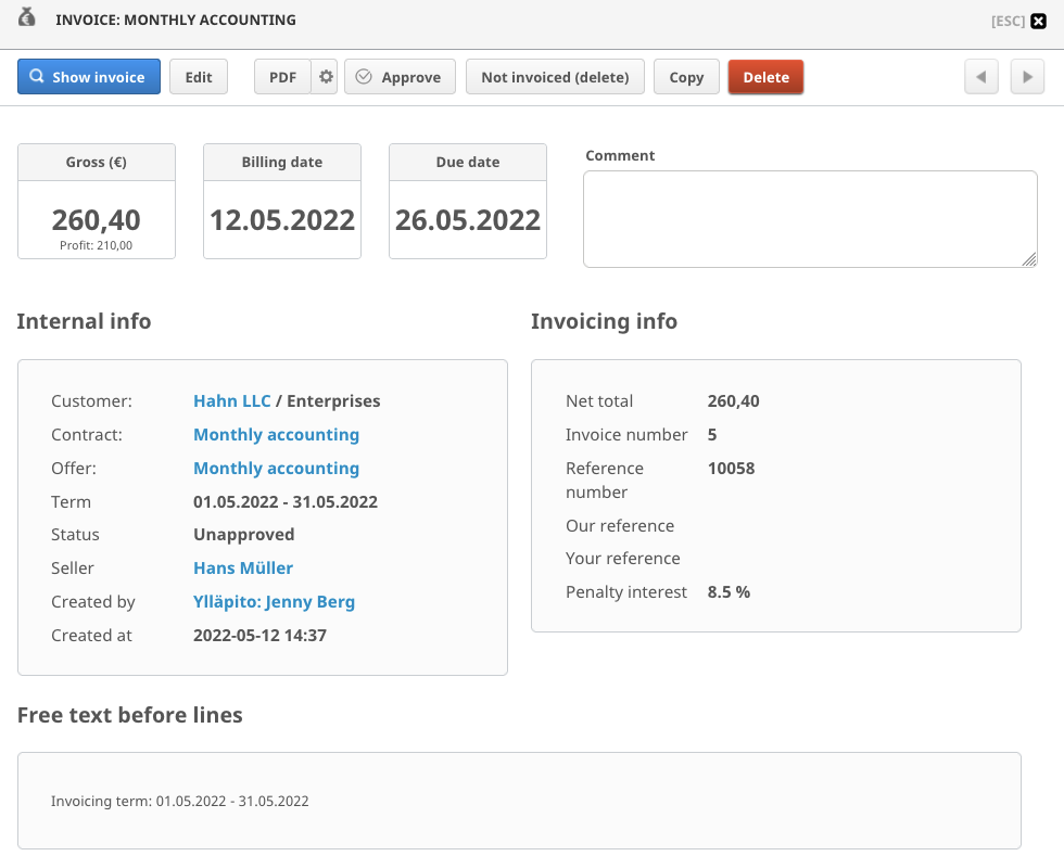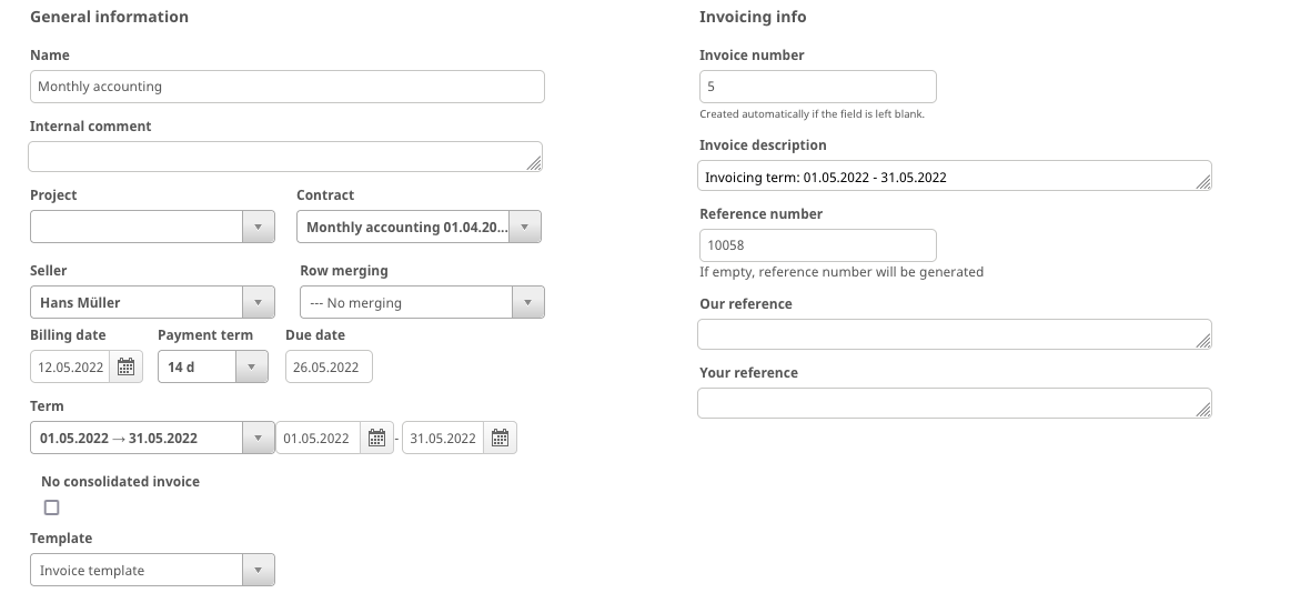On this section you can edit e.g. the name of the invoice, billing date, payment term or references.