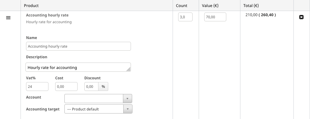 You can edit the amount and price of a product directly on the row. If you want to make further definitions for the product, click the product's name. Then you can edit e.g. the product's name, description or give discounts. You can also change the order of the rows from the icon that is at the beginning of each row. Choose the icon from the row you want to move, press the cursor and move the row to the desired place on the invoice, and then release your cursor.