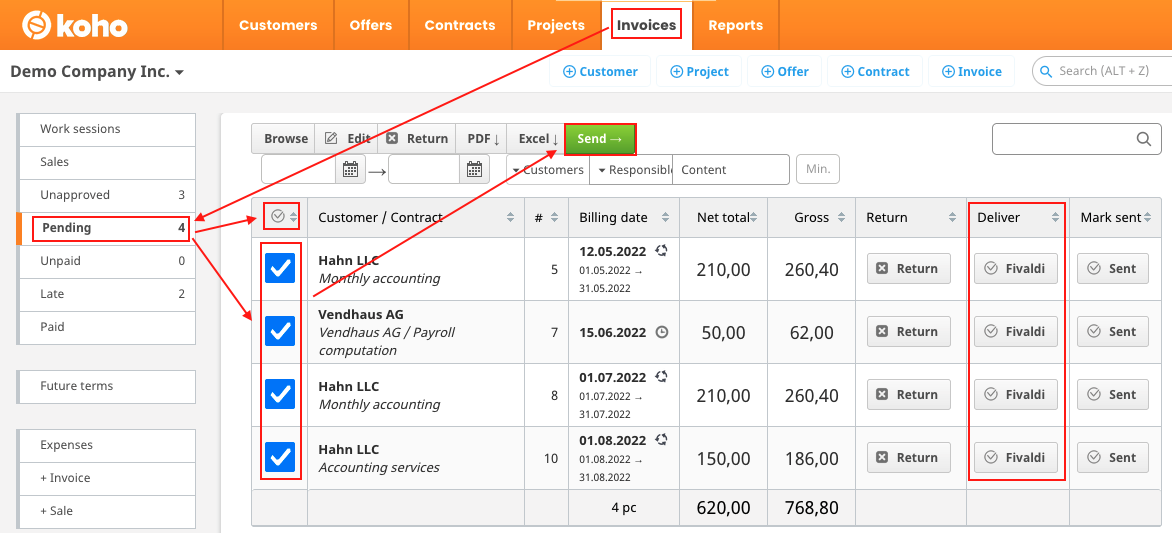 After you have approved invoices on the "Unapproved" tab, you can go to the "Pending" tab of the "Invoices" section where you can send the invoices. You can select invoices one by one or select all invoices from the round symbol on the top row. After you have selected all desired invoices, you can send them by clicking the green "Send" button. Alternatively you can send invoices from the deliver button on each row. Depending on the integration, Koho generates a transfer file or transfers the data directly to the external invoicing system.
