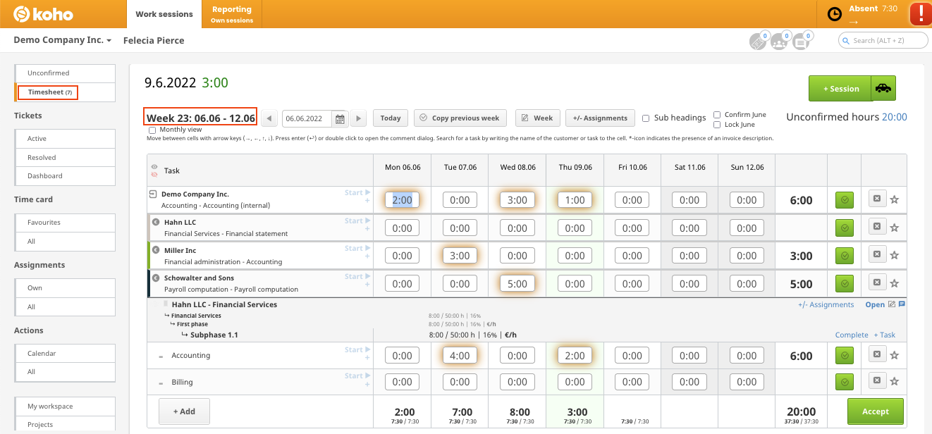Read more about tracking hours with Timesheet from this article: 2.3.3 Timesheet - Tracking and accepting working hours
