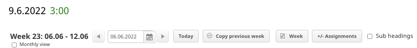 From the "Today" button you can easily move to the current week. "Copy previous week" button copies the previous week's task rows to the current week (the sessions are not copied).