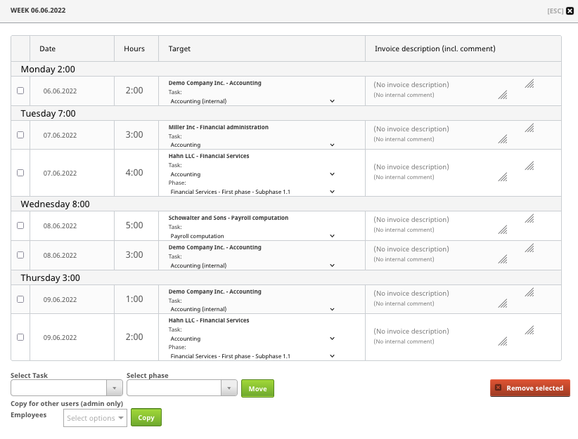 From the "Week" button you can view your sessions in a list form. You can add and edit invoice descriptions and internal comments. You can also change the task, duration and date of the session or remove sessions. Admin users can also copy the week to other employees.