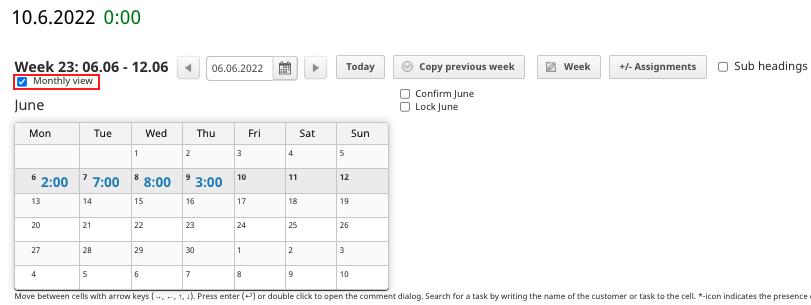 You can also open a monthly view by selecting the "Monthly view" field. From the calendar you can the amount of tracked hours for each day and go to the desired week by choosing a day from the calendar.
