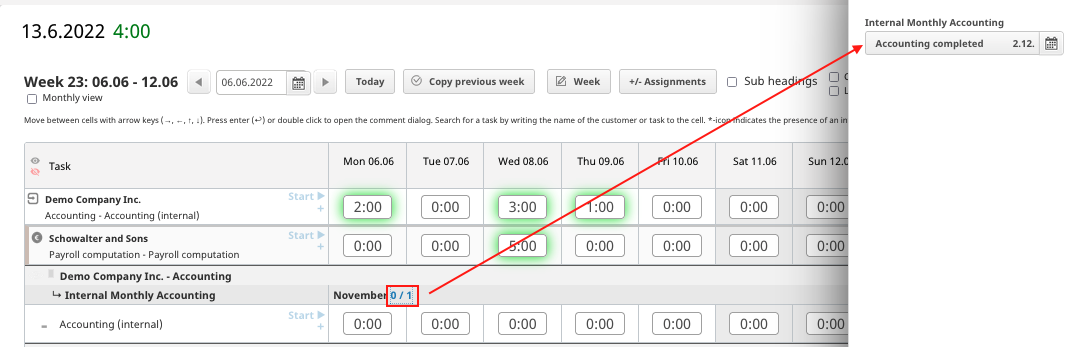 It is also possible to add assignment rows to Timesheet. Click the "+Add" button. Go to the "Add Assignment" tab and choose the desired customer and project. Now you can see all assignments related to the chosen project. You can also search for a customer, project or assignment with the search bar.