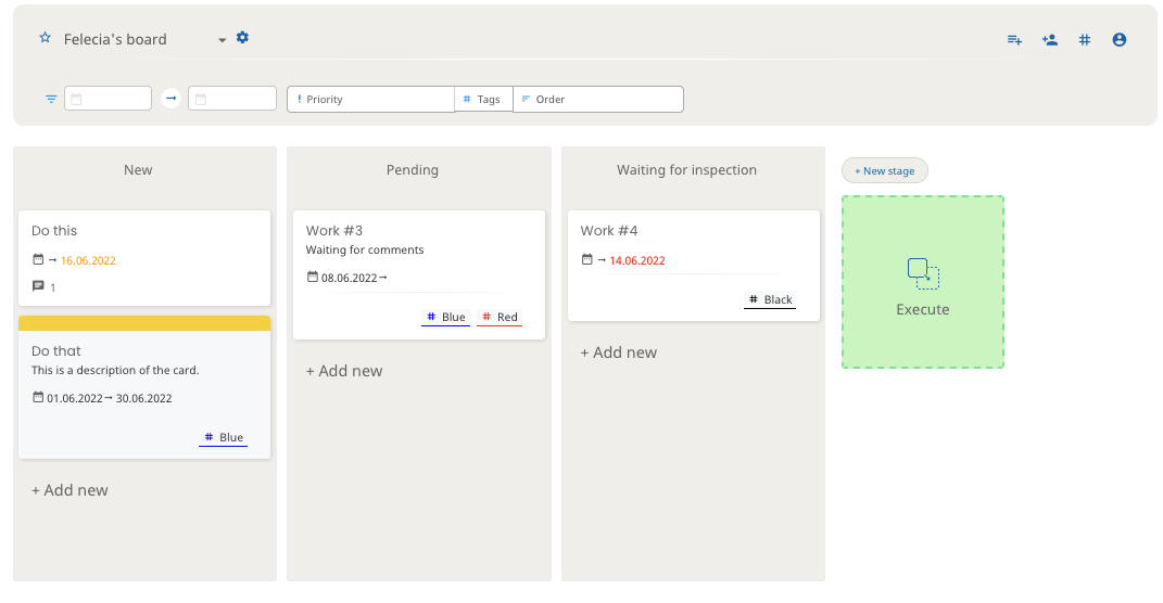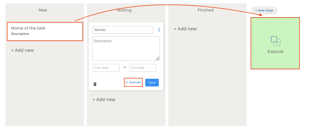 You can drag cards from one stage to another. After you have finished the card's task, you can drag the card to the "Execute" box or click "Execute" on the card.