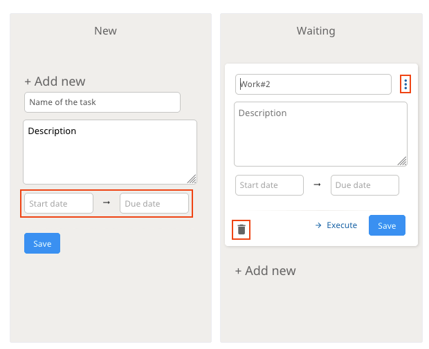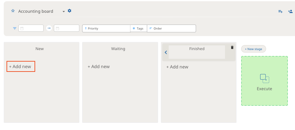 You can create new cards from the "+Add new" button. Cards can be for example single tasks related to your work.