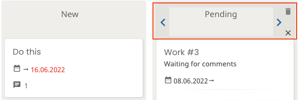 You can rename a stage by clicking its name which activates the field. Save the new name by clicking outside of the field. If there are several stages, you can move them to left or right from the arrow symbol next to the name. You can remove all cards inside a stage by clicking the cross symbol. The whole stage can be removed if there are no cards on it by clicking the trashcan symbol.
