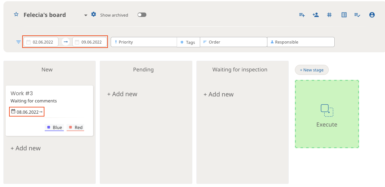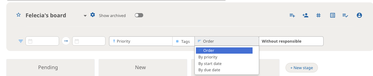 You can filter the cards by date, priority or labels. Click on the type of filter you want to set and choose the filter.