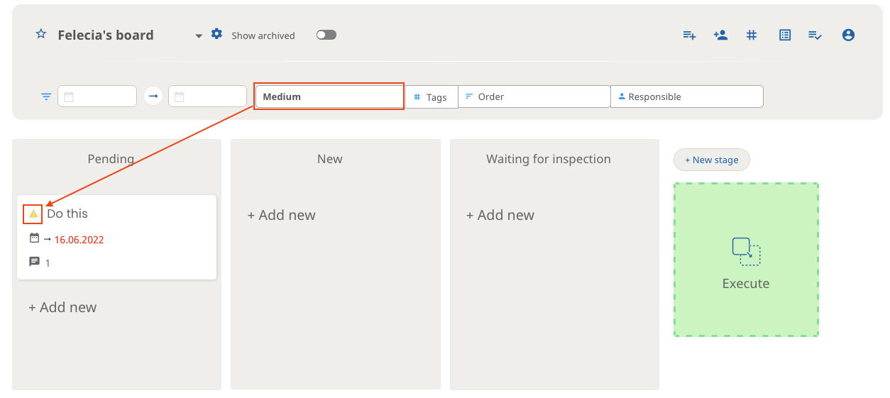 If you filter by priority, you can only see cards that have the selected priority. On the picture below, the priority filter is set to "Medium".