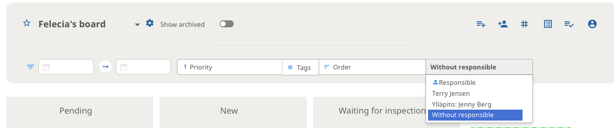 If you have set responsible persons to the cards, you can also use the responsible persons as filters. After choosing a responsible person, you can only see cards where this employee is responsible.