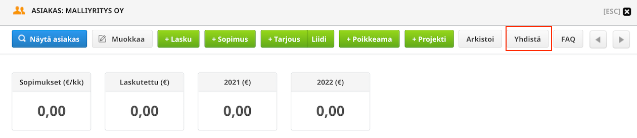 Asiakaskortin "Yhdistä" -painikkeella voidaan siirtää toisen asiakkaan sopimukset, laskut, projektit, työvuorot ja tarjoukset halutulle asiakkaalle. Tätä käytetään yleensä, jos asiakas on luotu järjestelmään useampaan otteeseen.