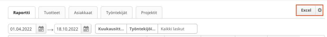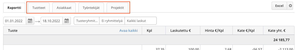 Raportin voi myös viedä Excel -tiedostoksi klikkaamalla oikean yläkulman "Excel" -painiketta. Painikkeen vieressä olevasta ratas - painikkeesta saa tulostettua tarkemman erittelyn exceliin, jossa on tuoterivikohtaisesti mm. laskun numero, jossa tuote on laskutettu ja asiakas.