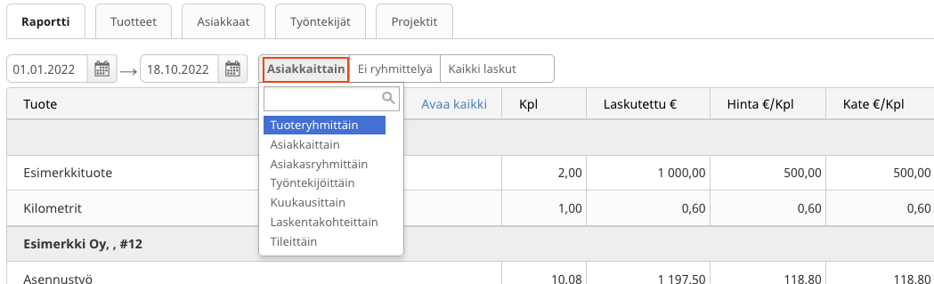 Oletuksena raportti on ryhmitelty tuoteryhmittäin, mutta ryhmittely on mahdollista tehdä myös asiakkaittain, asiakasryhmittäin, työntekijöittäin, kuukausittain, laskentakohteittain ja kirjanpitotileittäin.