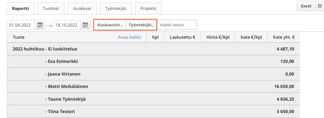 Raportille voi lisätä myös toisen ryhmittelytekijän, jolloin tuotelaskutusta voidaan tarkastella esimerkiksi kuukausittain työntekijöittäin.