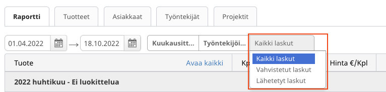 Oletuksena raportti näyttää laskutuksen kaikilta laskuilta, mutta raporttia on mahdollista rajata näyttämään vain vahvistetut tai lähetetyt laskut.